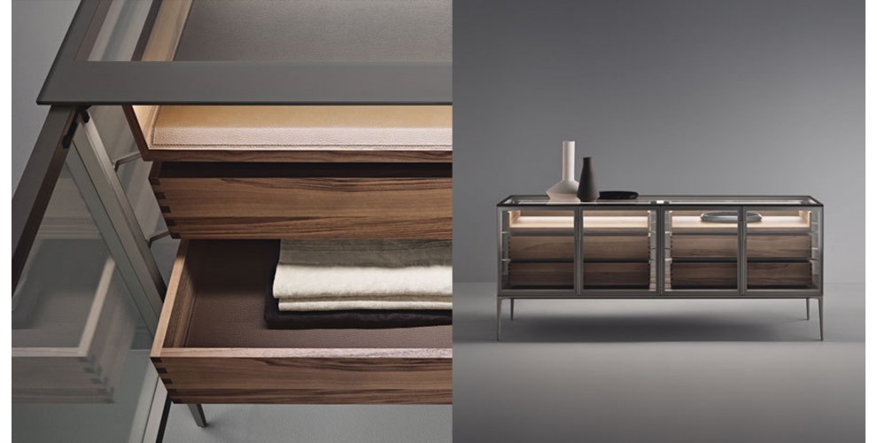 Mit Alambra bietet Rimadesio eine zeitgemäße Neuinterpretation klassischer Möbeltypen wie Sideboard, Vitrine und Stauraum mit Schubfächern an. Die Kollektion wird charakterisiert durch die besondere Struktur des Alluminiums.
